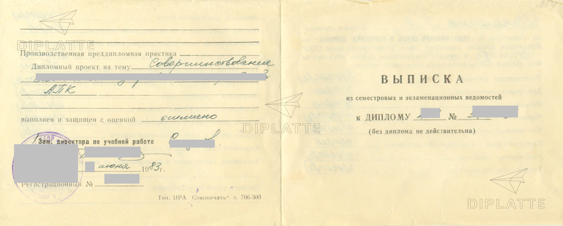 Чтобы вспомнить как выглядели дипломы среднего образования до 1996 года приводим тут образец. Оценочный лист выдавался на обычной бумаге без водяных знаков. Заполнялся и диплом и приложение от руки. Если это был диплом техникума союзной республики, то слева данные заполнялись на национальном языке, а справа — на русском.