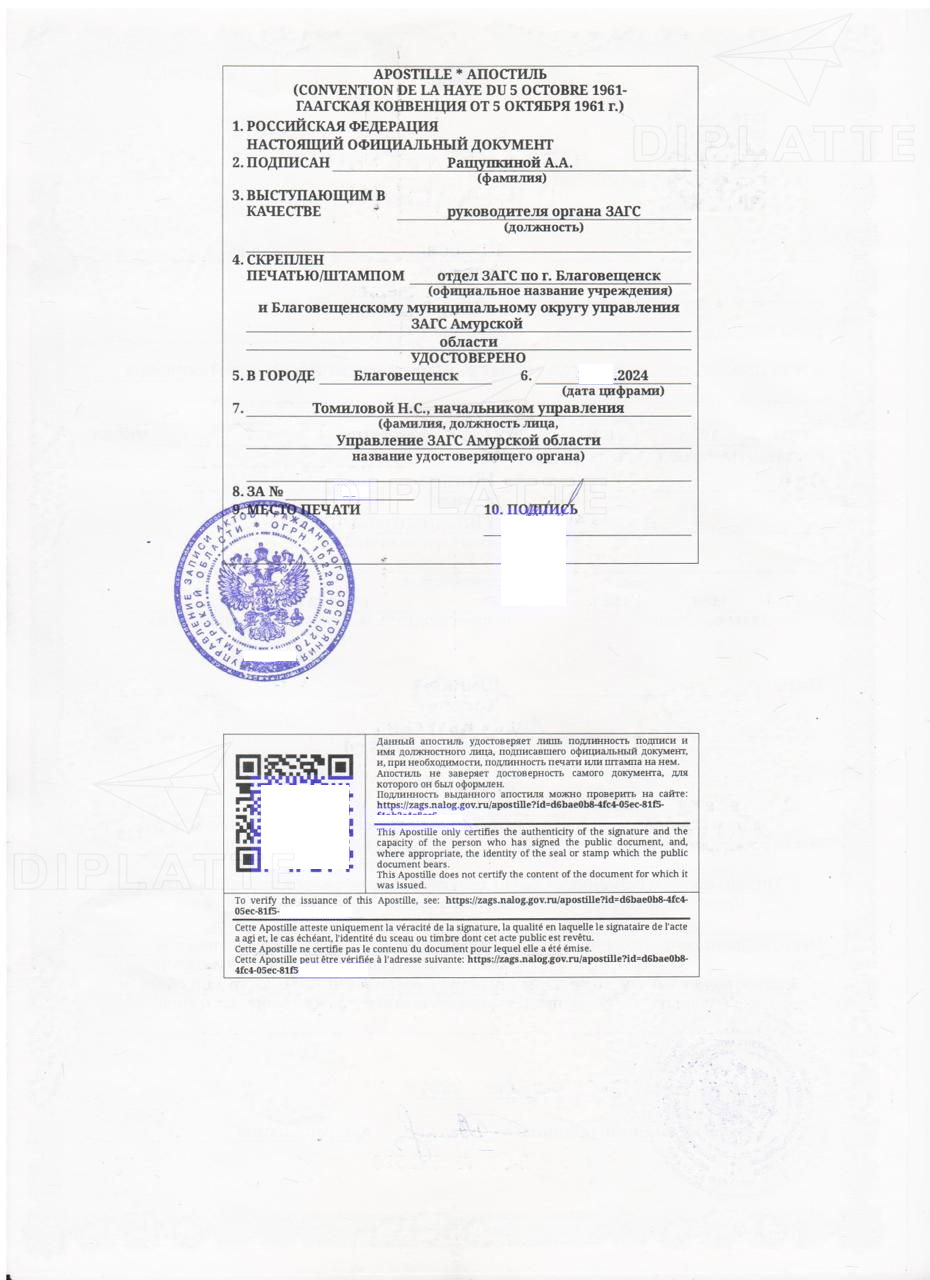 За дополнительную плату (на сентябрь 2024 года она составляет 10 000 рублей) у нас можно купить не только свидетельство о рождении, но и сделать апостиль на него или любой другой документ (например диплом, справку и т.п.). Апостиль понадобится вам для легализации документа за рубежом. Его делают профильные министерства, к которым относится выданный документ. Например свидетельства ЗАГС апостилируют органы ЗАГС или Министерство юстиции РФ. Если у вас есть образец нужного апостиля, то высылайте его нам и мы сделаем вам такой же, только с нужными изменениями. Если — нет, то не беда, у нас есть образцы апостилей практически со всех регионов России. И не только с органов ЗАГС, но и с МВД (если нужно апостилировать справку о несудимости) или Минобрнауки (если нужно заверить диплом, аттестат).